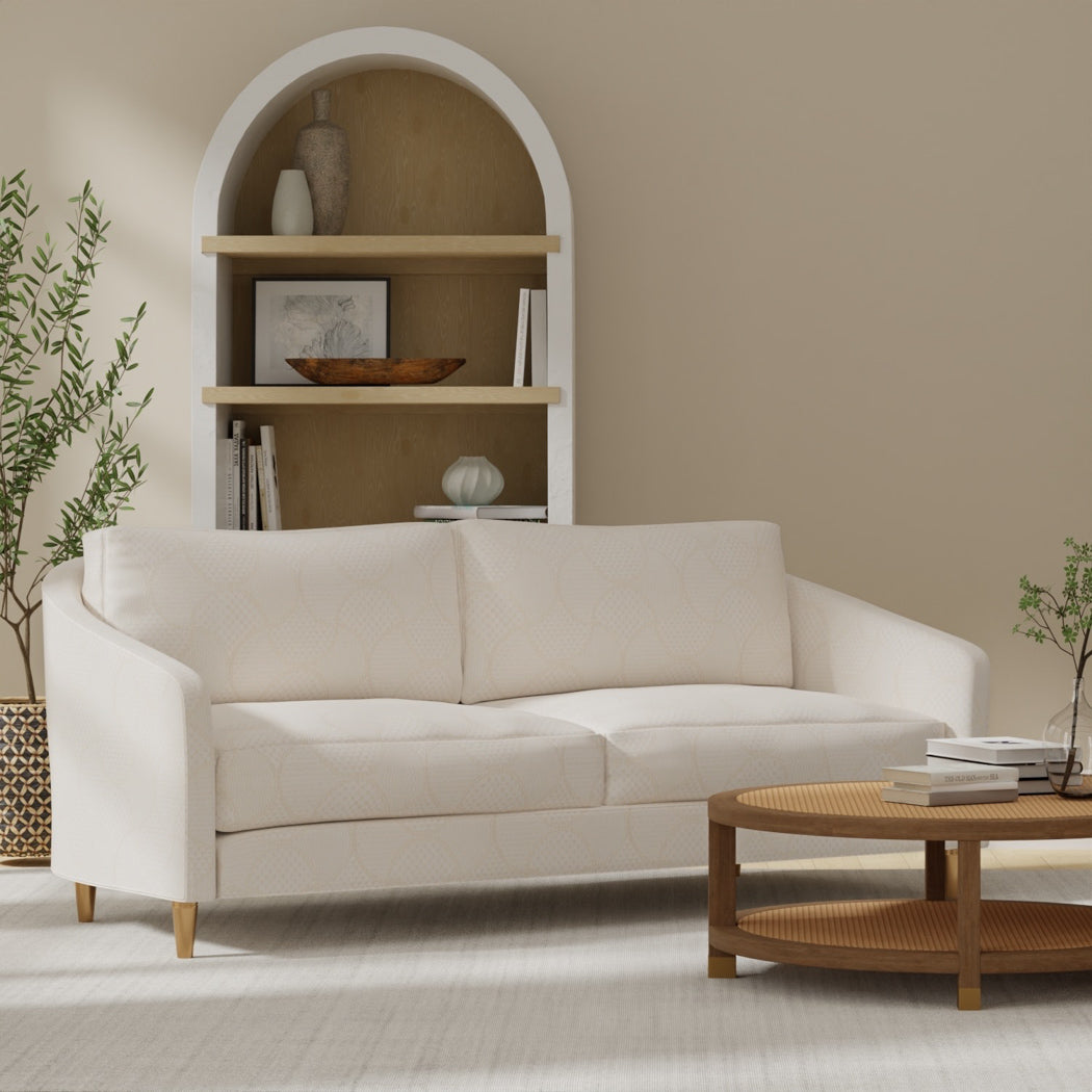 Crafted with Crypton technology, this fabric permanently repels liquid, stains, soil, and odors, making it the perfect choice for high-traffic areas and families with pets or children. But Arwen is more than just a practical solution, it's a work of art. The mesmerizing, stylized ogee pattern, with its internal patterned shapes, creates a fluid and visually pleasing design. The light beige color offers a versatile and timeless aesthetic, seamlessly blending with a wide range of decor styles.